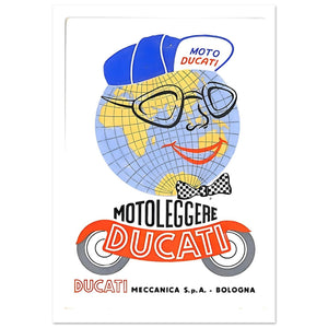 Embrace the playful spirit of Italian engineering with this Vintage Moto Ducati Globe Poster. This charming piece of retro advertising features a whimsical smiling globe character wearing a stylish checkered bow tie and a signature blue Ducati cap. Representing Ducati Meccanica Bologna, the artwork highlights the brand's global appeal and the joy of riding lightweight motorcycles. Its bold primary colors and mid-century modern design make it a standout collector's item for any automotive enthusiast's home or garage decor.
