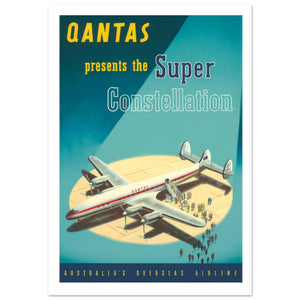 This vibrant Qantas Super Constellation Travel Poster highlights the airline's pride in offering cutting-edge air travel with the introduction of the Super Constellation aircraft. The bold design features the iconic airplane on the tarmac, ready to take passengers on their journey with Qantas, Australia's Overseas Airline. The retro art style, combined with the striking colors and sleek aircraft design, captures the golden age of air travel and showcases Qantas' role in connecting the world.