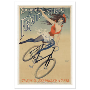 This colorful vintage poster showcases Société La Française, a French bicycle company. The image features a dynamic scene of a young woman in a vibrant red and white outfit, riding a bicycle with a graceful, energetic pose. She appears to be mid-motion, with a flowing skirt and a confident expression. The bike design is classic, with thick, round tires, symbolizing the era's technological advancement in cycling. The background is soft and minimalist, allowing the figure and bicycle to stand out. The poster, printed by Paul Dupont, includes the company’s address, 27 Rue St. Ferdinand, Paris.