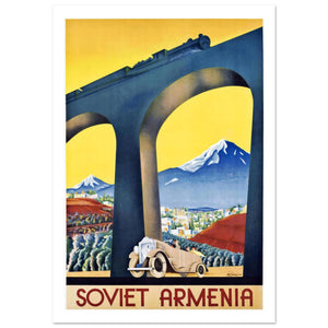 This vibrant Soviet Armenia Vintage Travel Poster captures the stunning landscape of Armenia, showcasing a steam train crossing a dramatic bridge with towering mountains in the background. Below, a car drives through the lush, green valley, symbolizing the connection between modern transport and the rich natural beauty of the region. The warm yellow sky and bold design invite travelers to explore this remarkable destination, making it a perfect piece for those interested in Soviet-era travel art and the allure of Armenia.