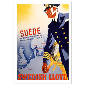 This vibrant vintage poster promotes travel to Sweden via Swedish Lloyd’s ships, with routes from London to Gothenburg and Stockholm. The bold illustration features a captain in full uniform, commanding the ship’s wheel, while a map highlights the journey. The ships “Suecia,” “Britannia,” and “Patricia” are showcased, offering a sophisticated, streamlined mode of travel to Scandinavia. The use of dynamic colors and a modern design reflects the era's excitement for international travel by sea.