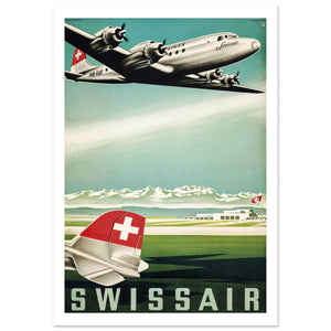 This striking Swissair Vintage Travel Poster captures the elegance and efficiency of Swiss air travel, featuring a sleek aircraft soaring above the snow-capped Swiss Alps. The bold Swiss flag on the tail of the plane symbolizes the country’s precision and reliability, while the vibrant colors of the sky and landscape convey a sense of adventure and modernity. Perfect for aviation and travel art enthusiasts, this poster highlights Swissair’s commitment to high-quality service and scenic journeys.