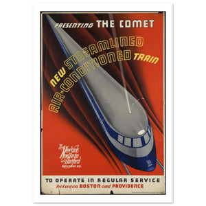 This striking The Comet "Streamlined Air-Conditioned Train" Vintage Poster showcases the futuristic design of the Comet, a cutting-edge, air-conditioned train introduced by the New York, New Haven, and Hartford Railroad Co. The dynamic design and bold typography emphasize the modernity and comfort of the train, which was set to operate between Boston and Providence. With its sleek, aerodynamic shape and vibrant color palette, this poster celebrates the innovation of mid-20th-century train travel, making it a perfect collectible for rail enthusiasts and design lovers.