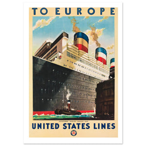 This striking United States Lines "Leviathan" Vintage Travel Poster showcases the grandeur of the Leviathan, the world's largest ship at the time. With its towering funnels and bold red, white, and blue design, the poster emphasizes the ship's immense size and its role in connecting travelers to Europe. A tugboat navigates the waters beside the massive vessel, evoking the power and prestige of ocean travel in the early 20th century. This captivating poster is a must-have for collectors of maritime and vintage travel art.