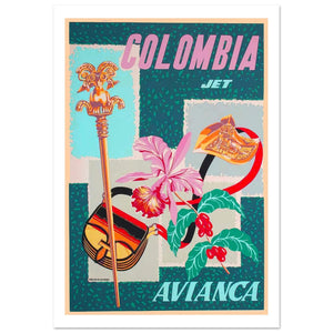 This vibrant vintage travel poster by Avianca promotes jet travel to Colombia through a striking collage of national symbols. Set against a textured emerald-green background, the artwork features a blooming pink orchid, a sprig of ripe red coffee cherries, and a traditional carriel bag. To honor the country’s rich history, two ornate golden pre-Columbian artifacts are prominently displayed, reflecting the region's ancient artistic legacy. The bold typography and layered graphic style capture the mid-century modern aesthetic of the "Jet Age." This piece beautifully synthesizes Colombia’s natural beauty and cultural heritage to entice international travelers.