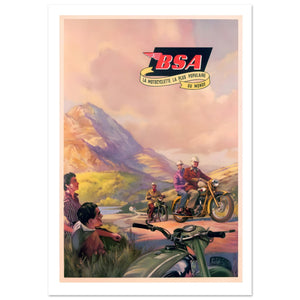 Celebrate the legacy of the "world's most popular motorcycle" with this stunning vintage BSA advertisement. The painterly artwork depicts a group of riders touring a breathtaking mountain landscape, capturing the freedom and adventure of the open road. A classic gold BSA 650 leads the way, while a couple watches from the grassy hillside in the foreground. This nostalgic print is a beautiful tribute to mid-century motorcycling culture and a must-have for any BSA enthusiast.