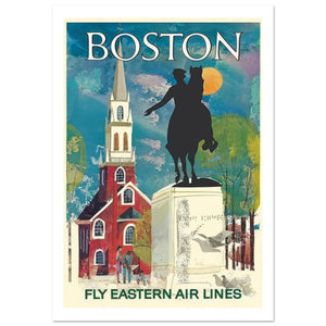 This charming vintage travel poster promotes Boston with an artistic rendering of the city’s historic landmarks. The poster features the iconic statue of Paul Revere on horseback, a symbol of American independence, set against the backdrop of a colorful sky and the Old North Church. Lush green trees and a serene sunset add warmth to the design, while two people strolling with a dog evoke a peaceful, inviting atmosphere. The "BOSTON" headline and "FLY EASTERN AIR LINES" at the bottom encourage travelers to explore the rich history and charm of this classic New England city.