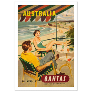 This evocative vintage travel poster for Qantas promotes Australia as a "So Near By" destination. The artwork features a stylish, sun-kissed couple relaxing on a balcony under a colorful striped awning, overlooking a picturesque coastline. The woman wears iconic mid-century white-framed glasses and a green swimsuit, while the man lounges comfortably with a drink nearby. In the background, a pristine beach, vintage cars, and a flying plane complete the scene of high-end leisure. The painterly style and warm colors capture the glamorous appeal of international travel during the mid-20th century.