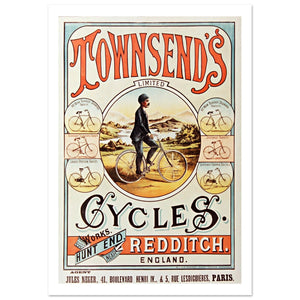 This vintage advertisement showcases Townsends Limited Cycles, an English brand based in Redditch. The central illustration features a dapper gentleman in a suit cycling through a scenic landscape of mountains and water. Surrounding this main image are six circular vignettes displaying various bicycle models, including the "New Ecossais Diamond Safety," "Ladies Pattern Safety," and a "Juvenile Safety" tricycle. The poster highlights the company's works in Hunt End and lists a Parisian agent on Boulevard Henri IV, illustrating the international reach of British manufacturing during the late 19th century.
