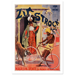 This striking vintage advertisement promotes Zim Strock & Cie, a bicycle manufacturer with a factory in Amiens and a showroom on Avenue de la G. Armée in Paris. The exotic illustration features a royal figure in ornate red and gold robes standing before a palace, accompanied by a snarling tiger. In the foreground, a man in a yellow turban and dhoti handles a sleek red bicycle, while other figures in traditional attire observe from the background. The artist Wilhio uses a rich, warm color palette and bold, stylized typography to associate the brand with luxury and international adventure.