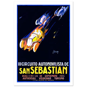 Striking 1925 poster for the III Circuito Automovilista de San Sebastian, showing fiery orange race cars streaking across a deep midnight background with comet-like trails. Bold yellow SAN SEBASTIAN lettering anchors the design, while red text announces prizes of 152,000, capturing speed and Spanish motorsport.
