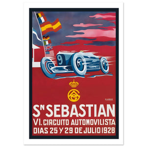 Bold 1928 racing poster for the VI Circuito Automovilista de San Sebastian, featuring a streamlined blue number 9 car streaking across a crimson course. International flags whip in the wind beside the grandstand, while sunset clouds and crest emphasize prestige, speed and timeless motor-sport heritage.