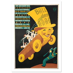 Playful German poster for the 1929 ADAC Costume Ball, featuring a smiling yellow car with top hat and dancing women, promoting the festive traffic-themed gala at Munich’s Deutsches Theater tonight.