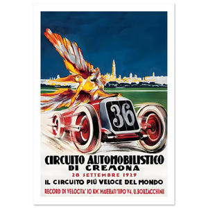 Dramatisk italiensk racingaffisch för 1929 års Circuito Automobilistico di Cremona, som visar en dånande röd Maserati nummer 36 som susar fram på världens snabbaste bana medan en flammande fågel Fenix brinner bakom, vilket symboliserar hastighet och ära mot silhuetten av Cremonas skyline och den djupa skymningshimlen.