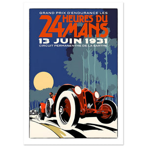Suggestiv affisch från 1931 års Le Mans uthållighetslopp som visar en flammande röd Alfa Romeo som dundrar genom en månupplyst skog på Circuit de la Sarthe. Djärv art déco-stil, höga träd och dramatisk låg perspektiv hyllar nattlopp, hastighet och det legendariska 24 Heures du Mans-evenemanget.