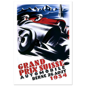 Slående 1934 Grand Prix Suisse-affisch som visar en silverfärgad racerbil med röd cockpit som susar förbi, hjulen suddiga i rörelse. Stiliserade Alper och ett kyrktorn i Bern reser sig i bakgrunden, medan röd typografi sveper diagonalt över botten och betonar hastighet, dramatik och schweizisk motor-racing prestige och arv.
