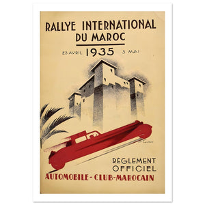 Elegant 1935 Rallye International du Maroc-affisch för Automobile-Club Marocain, som visar en strömlinjeformad röd touringbil som skär diagonalt över en sandig bakgrund under en stiliserad fästning och palm. Minimalistisk typografi och varma ökentoner framkallar exotiska nordafrikanska vägar, hastighet och äventyrlig långdistansrally.
