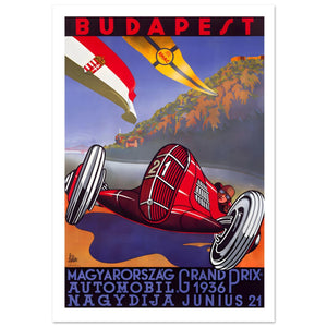 Striking Hungarian Grand Prix poster showing a red race car speeding along the Danube with Budapest’s hills and flags overhead, bold Art Deco lettering announcing the 1936 Magyarorszag automobile Nagydij.