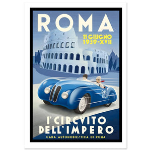 Elegant Art Deco-affisch för Circuito dell'Impero i Rom den 11 juni 1939, med en strömlinjeformad blå sportbil nummer 66 som susar förbi Colosseum. Svala blå toner, djärv typografi och flödande rörelselinjer hyllar hastighet, stil och den eviga stadens glamorösa motorbanetradition, tidlös.