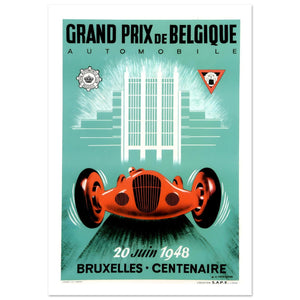 Slående belgisk racingaffisch för 1948 års Grand Prix de Belgique vid Bruxelles-Centenaire, med en klar röd en-sits som rusar mot betraktaren under en strålande modernistisk utställningshall. Djärv typografi, teal-färgad bakgrund och dynamisk hjulrörelse framkallar efterkrigstidens optimism, hastighet och nationella stolthet inom motorsport.