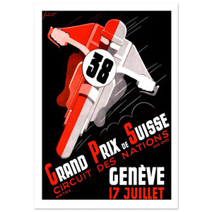This striking vintage poster promotes the 1955 Grand Prix de Suisse, held at the Circuit des Nations in Geneva on July 17th. Featuring dynamic, bold artwork, the poster highlights a motorcyclist in motion with the number "38" on the bike. The use of red, white, and black colors conveys speed and excitement, while the sleek design captures the essence of the race. The inclusion of "Side-cars" emphasizes the thrilling and unique aspect of the competition. The clean, impactful typography directs attention to the event details, making this an iconic piece of motorsport history.