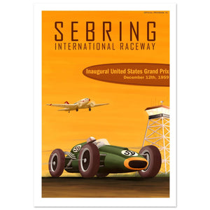 Stämningsfull affisch för den första United States Grand Prix på Sebring International Raceway, den 12 december 1959, som visar en grön nummer 59 en-sitsig bil som susar längs banan medan ett klassiskt passagerarflygplan lyfter bredvid kontrolltornet, och fångar Floridas solsken, flyghistoria och spänningen i formelracing.