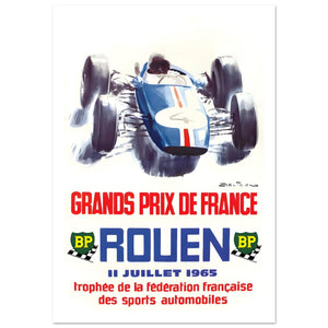 Dynamisk vintage racingposter för 1965 års Grands Prix de France i Rouen, med en blå Formel 1-bil med fransk trikolorrand som hoppar framåt, suddiga hjul som antyder hastighet, djärv röd och blå typografi samt BP-emblem som hyllar klassisk fransk motorsport från mitten av sextiotalet med prestige och arv.