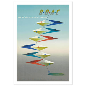 This striking mid-century travel poster for British Overseas Airways Corporation (BOAC) utilizes abstract, geometric design to promote its global reach. Created by renowned graphic designer Abram Games, the artwork features a vertical, mobile-like stack of stylized, diamond-shaped aircraft symbols. These colorful elements, accented with dots, spiral upward against a soft gradient background of blue and grey, suggesting movement and connectivity. The minimalist typography at the top declares the airline's mission to "Fly to all six continents". This sophisticated design captures the burgeoning optimism and technological elegance of the post-war international aviation era.