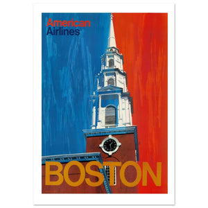 This striking American Airlines poster showcases the iconic Boston skyline, highlighting a prominent church steeple with a bold, modern design. The vibrant red and blue color scheme creates a dynamic and eye-catching effect, while the simple, large "BOSTON" text at the bottom emphasizes the city's importance. This poster conveys the historical and cultural charm of Boston, inviting travelers to explore one of America's most storied cities.