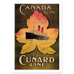 This stunning vintage poster promotes travel to Canada aboard the Cunard Line, artistically framed by a maple leaf. The silhouette of a grand ocean liner emerges from the leaf's vibrant colors, symbolizing Canada's connection to the sea and its heritage. The bold lettering and warm, nostalgic design evoke a sense of adventure and luxury travel, enticing travelers to embark on a remarkable journey across the Atlantic. The ship's two signature funnels and the rich color palette emphasize the elegance and prestige of the Cunard Line.