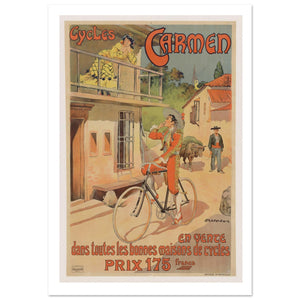 This vintage poster for Cycles Carmen exudes a sense of adventure and romance. A dashing man in a brightly colored outfit and wide-brimmed hat rides his bicycle through a quaint village, drawing the attention of a woman leaning over a balcony. The vibrant yellow and red colors of the poster highlight the lively, flirtatious atmosphere. The man’s pose, with one hand raised in a casual gesture, suggests confidence and charm. The bold text promotes the bicycle at 175 francs, positioning it as an affordable yet stylish choice for discerning customers. The scene evokes the charm of the open road and a carefree, adventurous spirit.