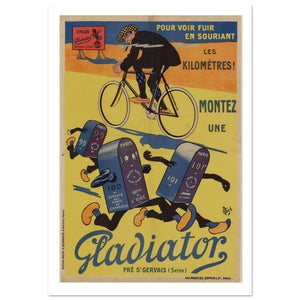 This colorful and playful vintage poster promotes Gladiator Cycles, encouraging people to “see the miles fly by with a smile” by showcasing a cyclist joyfully riding the bike. The slogan emphasizes the ease and fun of cycling long distances with the Gladiator bike. The humorous design features animated, smiling mile markers running alongside the bike, creating a dynamic and energetic visual. The bright yellow background adds to the lively tone of the poster, while the cyclist’s outfit and the whimsical characters in the design reflect the charm and character of vintage cycling advertisements. The logo and details at the bottom indicate the brand's origins from Pré S’t Gervais, Seine.