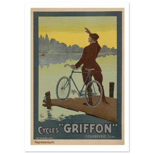 This serene vintage poster for Griffon Cycles captures the essence of leisurely cycling amidst nature. A well-dressed man, wearing a cap and brown attire, stands beside his bicycle on a dock, gazing at the peaceful river scene at sunset. The soft colors of the sky and the calm water create a tranquil atmosphere, highlighting the freedom and enjoyment of cycling. The prominent Griffon Cycles branding at the bottom suggests that these bikes are the perfect companion for outdoor adventures, combining style with practicality. The image invites the viewer to imagine themselves embarking on their own cycling journey in beautiful surroundings.