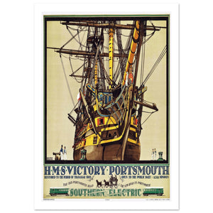 HMS Victory Portsmouth Poster This vibrant vintage poster highlights the iconic HMS Victory, emphasizing its restoration to the period of 1805. The detailed image of the historic ship captures its grandeur and intricate rigging. The poster invites the public to visit, showcasing the ship as a major attraction in Portsmouth. Below, a Southern Electric train is depicted, offering convenient travel to the site, making it easy for visitors to access this historical landmark. The use of bold colors and classic typography adds to the poster’s appeal. The vintage style of this poster makes it a great choice for your stylish home!With our heavier-weight, premium-quality, semi-glossy paper, you enjoy artwork that pops with enhanced colors and a subtle shine. The finish also adds a layer of protection, preventing the poster from fading over time due to exposure to light or moisture. Features: With a paper weight of 200 gsm/ 80 lb, it is perfect for long-lasting prints that are stunning to look at in all their vibrant glory. We use FSC-certified paper or equivalent certifications depending on regional availability. It’s better for the people and the planet. Each poster is shipped in robust packaging, ensuring it arrives safe and secure. Paper sizes may vary slightly by region. For the US and Canada, the measurement is in inches, while for the rest of the world, it is in centimeters. It is printed and shipped on demand. No minimums are required.