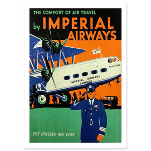 This vintage travel poster from Imperial Airways promotes the "comfort of air travel" aboard the airline's aircraft, featuring a prominent view of the "Hannibal" plane. The illustration, with its vibrant orange and green hues, conveys a sense of adventure and modernity, while the saluting pilot in uniform emphasizes the professionalism and reliability of the service. The iconic design reflects the golden age of aviation, capturing the excitement of flying with one of Britain's premier airlines.
