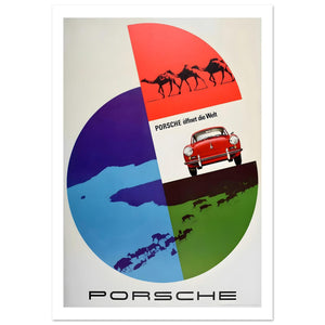 Stilfullt mid-century Porsche-poster med en röd 356 placerad inom en segmenterad glob av öknar, hav och slätter med djur, under sloganen ”Porsche öppnar världen” – Porsche opens the world.