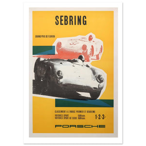 Färgstark Porsche-poster som firar framgångarna vid Sebring Grand Prix de Florida, med två lager av bilder på eleganta silverfärgade sportbilar mot en djärv gul bakgrund. Grafiska färgblock och rastertexturer skapar en modern, dynamisk hyllning till 1-2-3-placeringar i sportbilsklasser där totalt.