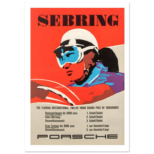 Levande Porsche-affisch som hyllar Sebrings Florida International Tolvtimmars Grand Prix i uthållighet. En stiliserad förare med hjälm och blå glasögon dominerar den flammande röda övre halvan, medan texten nedtill listar segrar för Schell, Seidel, von Hanstein och Linge, vilket understryker Porsches styrka och racingarv.