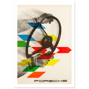 Slående Porsche-poster med handskbeklädda händer som greppar ett klassiskt ratt i rörelse, överlagrade med djärva röda, gula, blå och gröna pilar. Minimalistisk krämfärgad bakgrund och modern typografi förmedlar precision, hastighet och förarfokus, och hyllar den rena kopplingen mellan mänsklig skicklighet och sportbilsingenjörskonst.