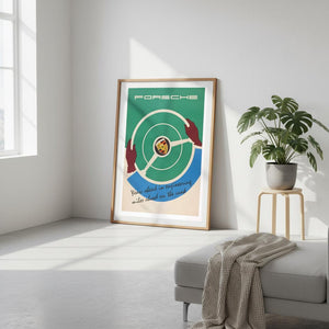 Stiliserad Porsche-poster som visar handskbeklädda händer på en minimalistisk grön och blå ratt, centrerad av det historiska vapnet. Ren typografi och den svepande sloganen ”År före i ingenjörskonst, mil före på vägen” uttrycker innovation, förarengagemang och varumärkets framåtblickande sportbilsidentitet och arv.