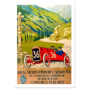Färgstark vintageaffisch för Real Moto Club de Cataluñas första spanska Autociclos Championship, Copa de S.M. El Rey. En klarröd bil med nummer 36 susar fram längs en dammig bergsväg, två glada förare mot frodiga gröna kullar, som firar det tidiga iberiska motoräventyret och arvet.