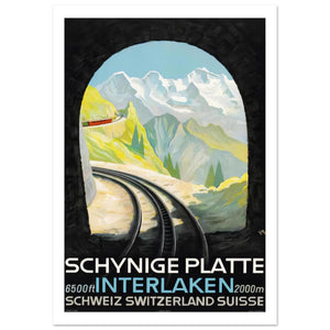 Denna poster fångar den hisnande utsikten från Schynige Platte järnvägsrutt, belägen i de schweiziska Alperna. Bilden visar en livfull, solbelyst scen när tåget kommer ut ur en tunnel och erbjuder en panoramavy över snötäckta toppar, frodiga gröna dalar och slingrande spår. Med texten som betonar höjden (6500 ft/2000 m) inbjuder postern resenärer att uppleva de fantastiska vyerna över Interlaken, Schweiz, och framhäver skönheten i schweizisk tågresa mitt i det alpina landskapet.