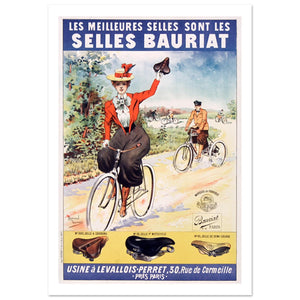 This elegant vintage poster promotes Selles Bauriat, a high-quality French bicycle saddle brand. A well-dressed woman, confidently riding her bicycle, waves her hat while showcasing the comfort and luxury of the Bauriat saddles. Behind her, other cyclists ride along a scenic path, further emphasizing the brand’s appeal to both practicality and style. The bold text "Les meilleures selles sont les selles Bauriat" ("The best saddles are Bauriat saddles") reinforces the quality of the product. The lower section of the poster displays various saddle models, including those for motorcycles and racing, highlighting the brand’s versatility and craftsmanship.
