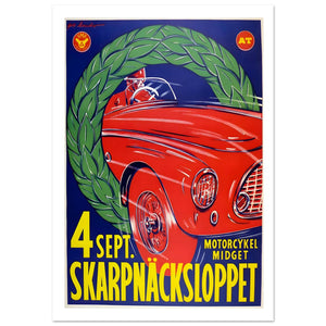 Djärv svensk racingaffisch för Skarpnäcksloppet, med en klarröd sportbil och en förare med skyddsglasögon som rusar genom en gigantisk grön lagerkrans på djupblå bakgrund. Livfull gul text annonserar evenemanget den 4 september för motorcykel- och midgetracing, som firar hastighet, seger och festlig tävlan.