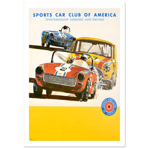 Färgstark Sports Car Club of America-affisch med en röd nummer 2 roadster som leder en gul Mini och en blå coupé genom en skarp kurva. Dynamiska penseldrag och en djärv gul panel framhäver den gräsrotsbaserade racingens spänning medan sloganen 'Sportsmanship Demands Safe Driving' främjar ansvarsfull tävling överallt.