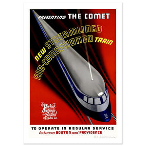 Denna livfulla affisch visar det eleganta, nya, luftkonditionerade "Comet"-tåget, designat för reguljär trafik mellan Boston och Providence. Med sin strömlinjeformade design och djärva, iögonfallande färger, främjar den en modern och bekväm reseupplevelse. Tågets futuristiska utseende förstärks av den dynamiska typografin, vilket gör det till ett slående exempel på transportreklam från New York, New Haven och Hartford Railroad.