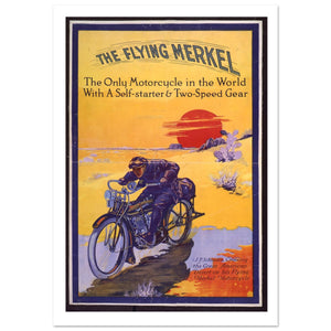 Denna fängslande vintageannons marknadsför The Flying Merkel och hävdar att det är den enda motorcykeln i världen utrustad med både självstart och tvåväxlad växellåda. Affischen visar en äventyrlig förare som kör över öknen, med den ikoniska röda solen som går ner i bakgrunden, vilket framhäver motorcykelns robusthet och banbrytande teknik. Den fångar levande andan av tidig motorcykelinnovation och äventyr.