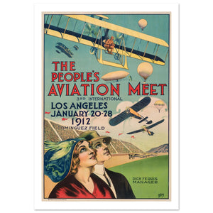This vibrant poster promotes The People's Aviation Meet, a historic aviation event held in Los Angeles from January 20-28, 1912, at Dominguez Field. It features a thrilling scene of early 20th-century aviation with a bi-plane soaring above, accompanied by hot air balloons and airplanes flying in the background. The colorful illustration captures the excitement of the time, with a couple gazing upward in awe. This piece represents the public's fascination with flight and marks an important milestone in early aviation history.