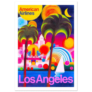 This colorful, vibrant vintage American Airlines poster captures the essence of Los Angeles in a bold, abstract style. The poster features iconic imagery such as palm trees, sunsets, and modern architecture, set against a backdrop of bright, playful colors. The combination of vivid oranges, pinks, and blues creates an energetic, welcoming atmosphere, inviting travelers to experience the lively, sunny spirit of LA.