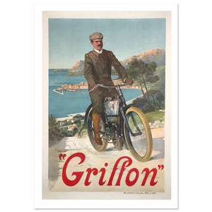 Transport yourself to the dawn of motorized travel with this exquisite vintage 1904 Griffon poster. The elegant artwork features a gentleman in classic motoring attire, including a flat cap and high boots, riding an early Griffon motorcycle down a scenic coastal road. With a breathtaking Mediterranean bay and sun-drenched hills in the background, this French lithograph captures the romance of Edwardian exploration. Bold red "Griffon" typography anchors this beautiful nostalgic collectible, perfect for enthusiasts of antique bikes and Belle Époque design.
